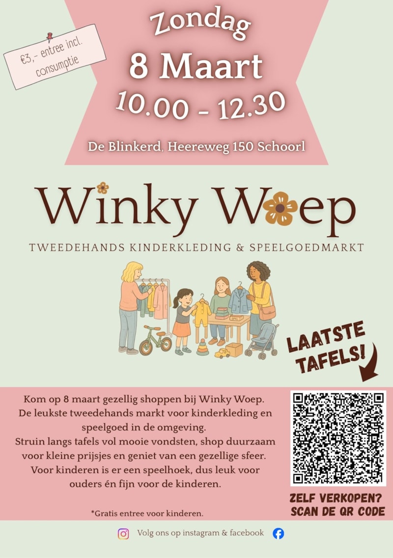 Op zondag 8 maart 2026 is het weer zover: Winky Woep, de gezellige tweedehands markt voor kinderkleding en speelgoed, vindt plaats in Dorpscentrum De Blinkerd in Schoorl.